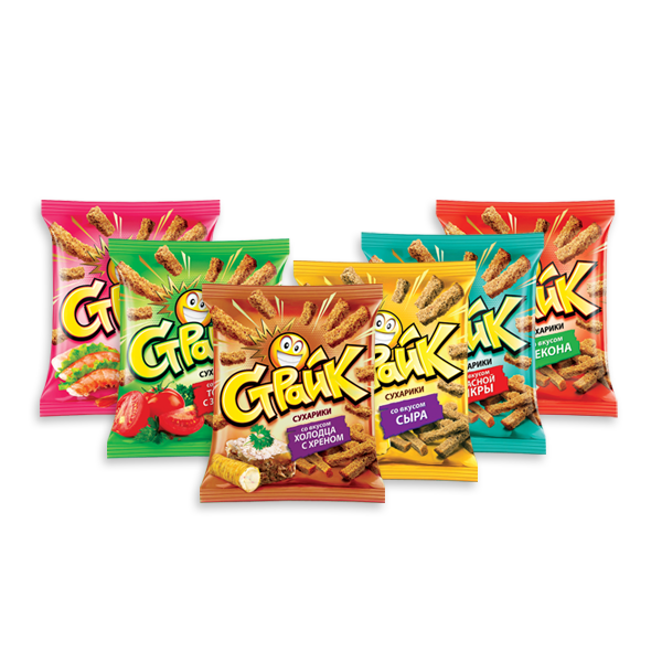 Сухарики СТРАЙК Ассорти (бекон,томат, холодец,креветка,икра, сыр) 90 гр./36 в уп.
