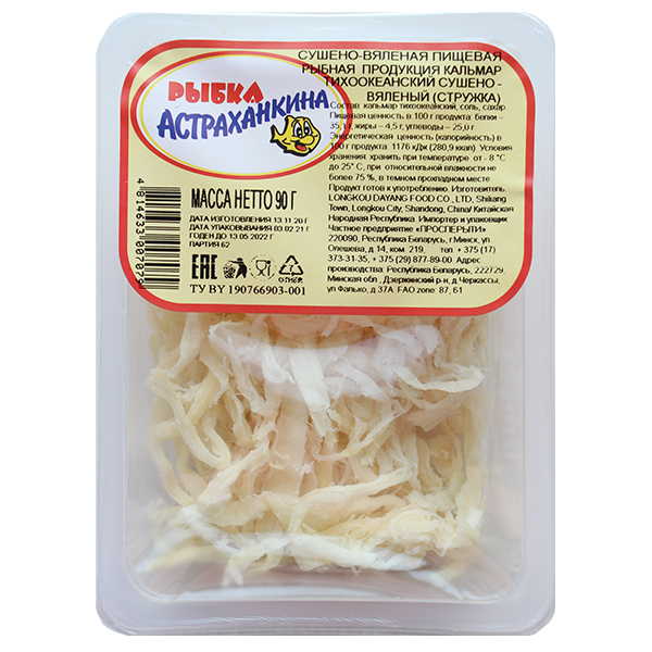 Сушено-вяленая пищевая рыбная продукция. Кальмар тихоокеанский сушено-вяленый (стружка) ТМ Астраханкина 90 г